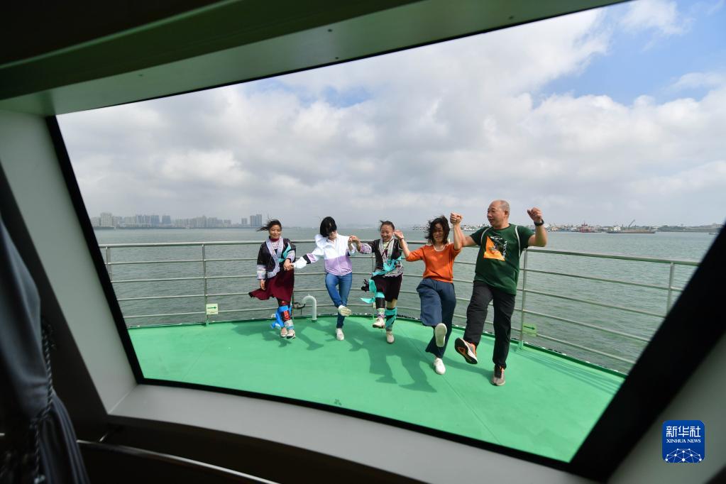 在广东廉江市近海海域的游船上,来自广西融水苗族自治县杆洞乡党鸠村乌英苗寨的妇女梁足英(左三)和吴妹富(左一)和游客一起跳舞(11月4日摄)。在廉江市爱心人士的支持下,她们第一次走出大苗山参观学习。