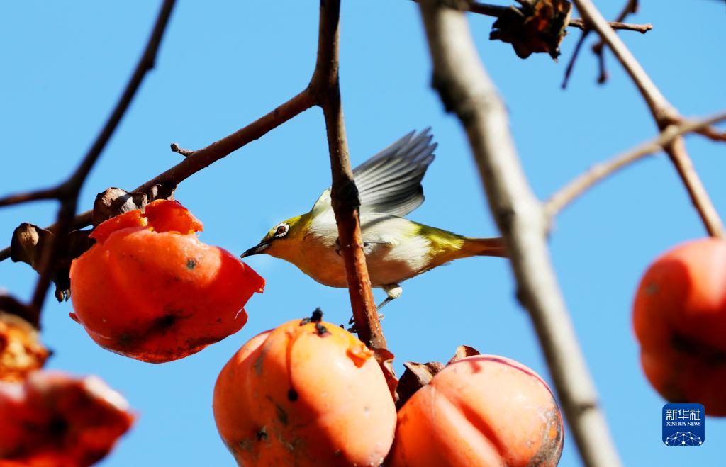 12月2日,一只绣眼鸟落在树枝上品尝柿子果实。