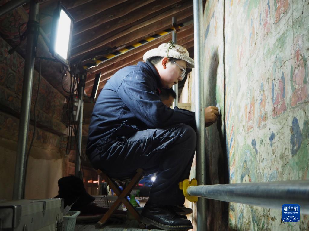 2021年4月27日,壁画修复师在位于青海省海东市的瞿昙寺修复壁画。