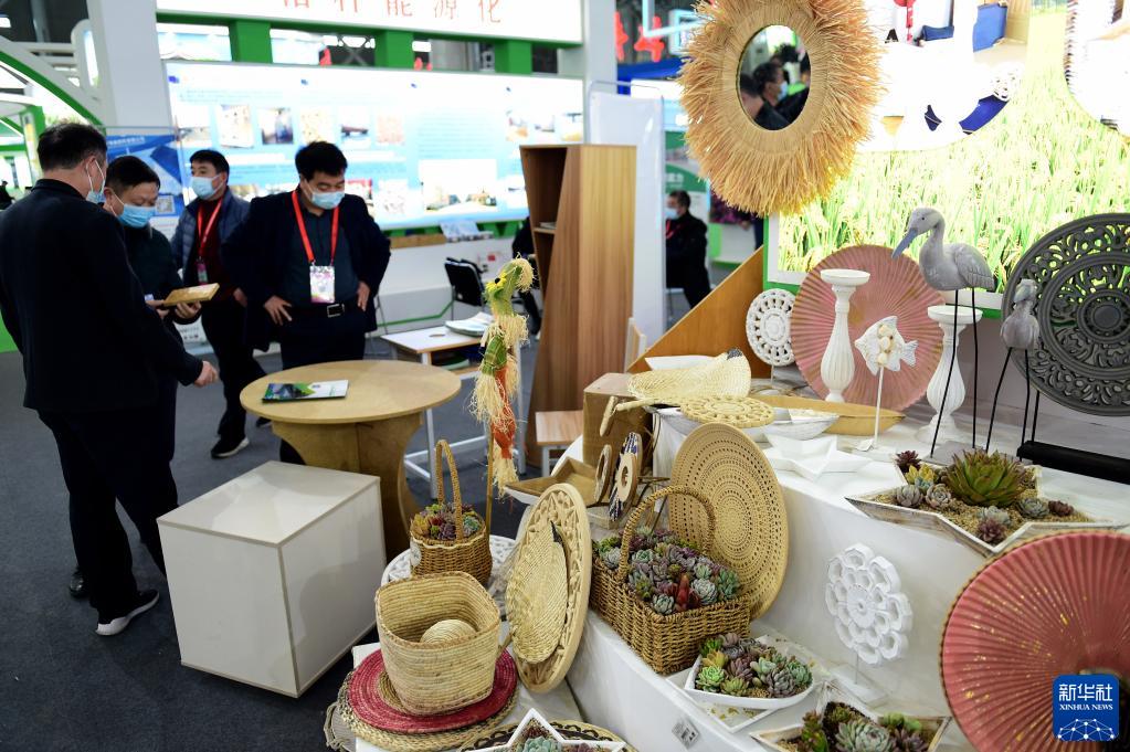 12月3日,参观者在2021安徽秸秆暨畜禽养殖废弃物综合利用产业博览会上了解用秸秆制作的工艺品。