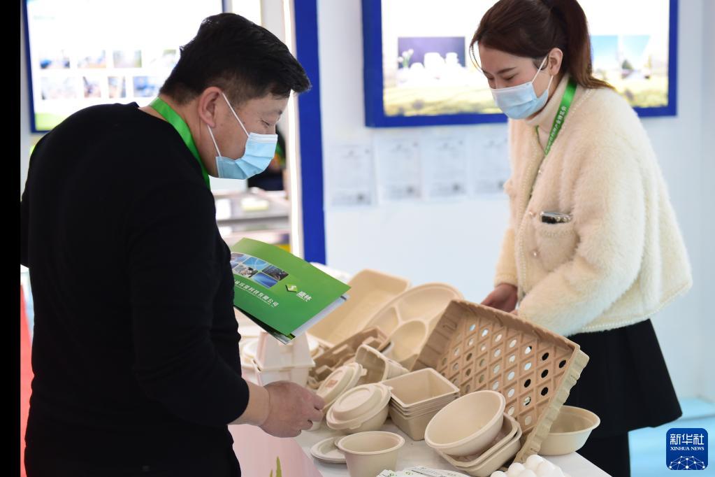 12月3日,参观者在2021安徽秸秆暨畜禽养殖废弃物综合利用产业博览会上了解一款秸秆餐具。