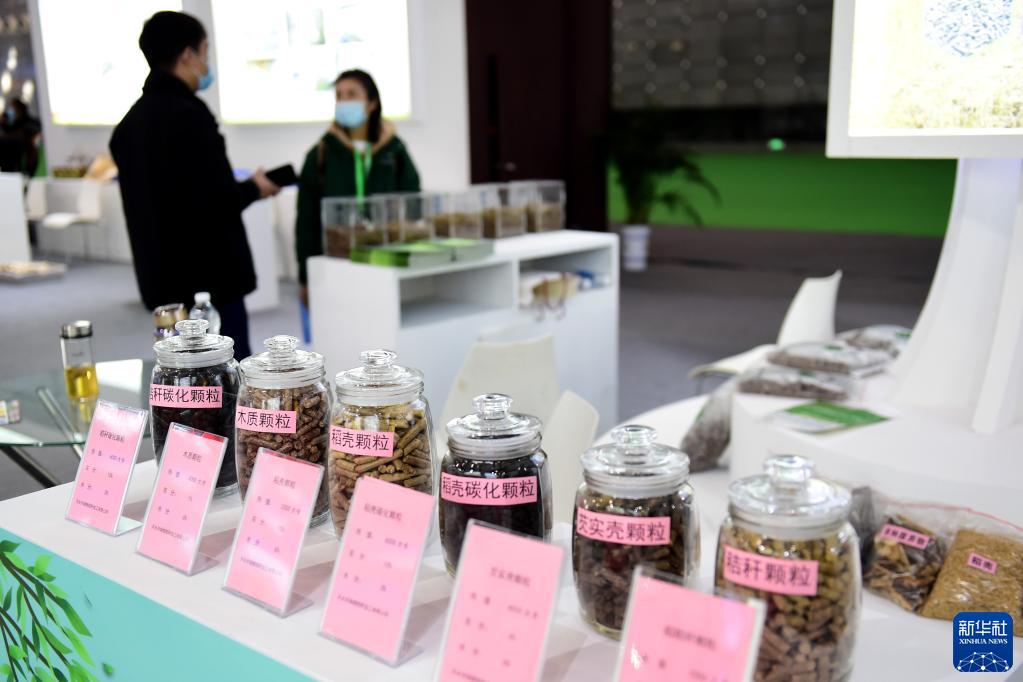 12月3日,参观者在2021安徽秸秆暨畜禽养殖废弃物综合利用产业博览会上了解用秸秆制作的生物质燃料。