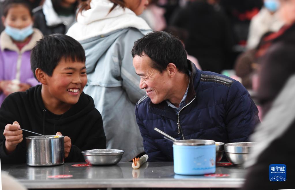 12月2日,卢文建(右)在学校食堂和学生一起吃饭。