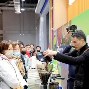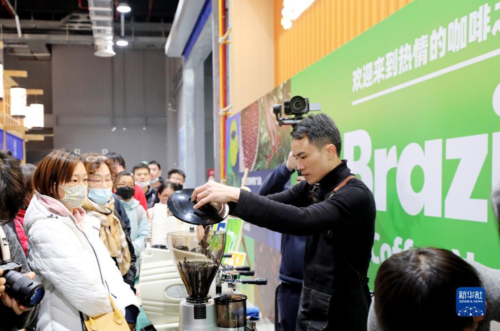 12月3日,一名咖啡师在品鉴活动中用巴西咖啡豆为来宾现场制作咖啡。