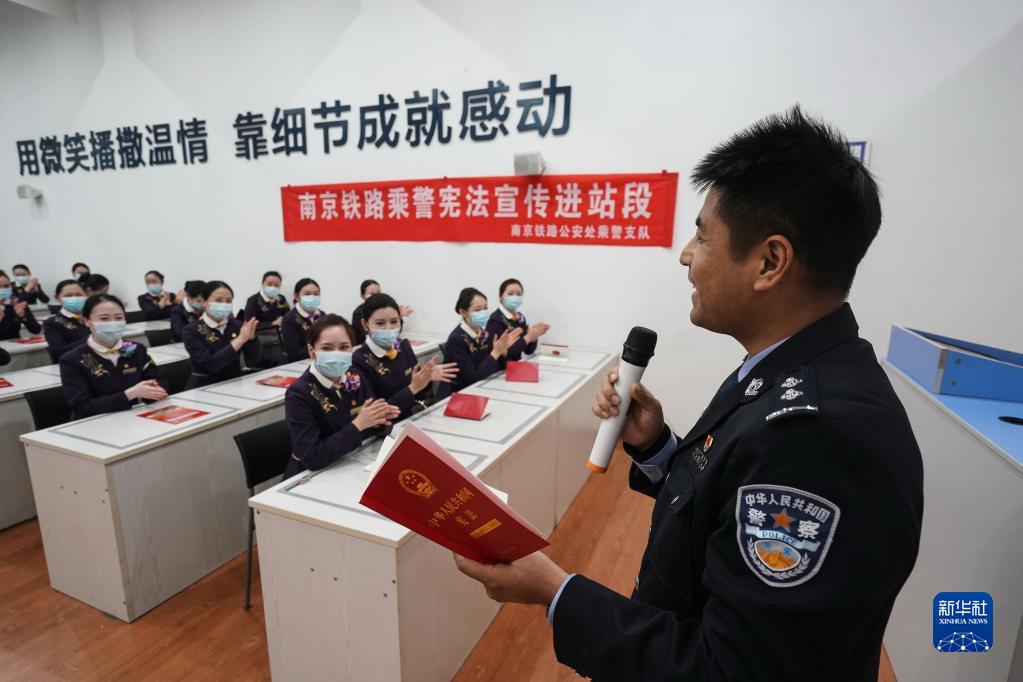 当日,南京铁路公安处乘警支队民警来到中国铁路上海局集团有限公司南京客运段,开展宪法宣传活动,迎接国家宪法日的到来。