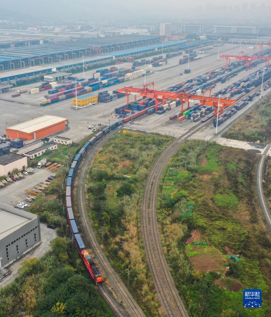 12月4日,中老铁路(成渝—万象)国际货运首发班列从重庆国际枢纽园区发出(无人机照片)。