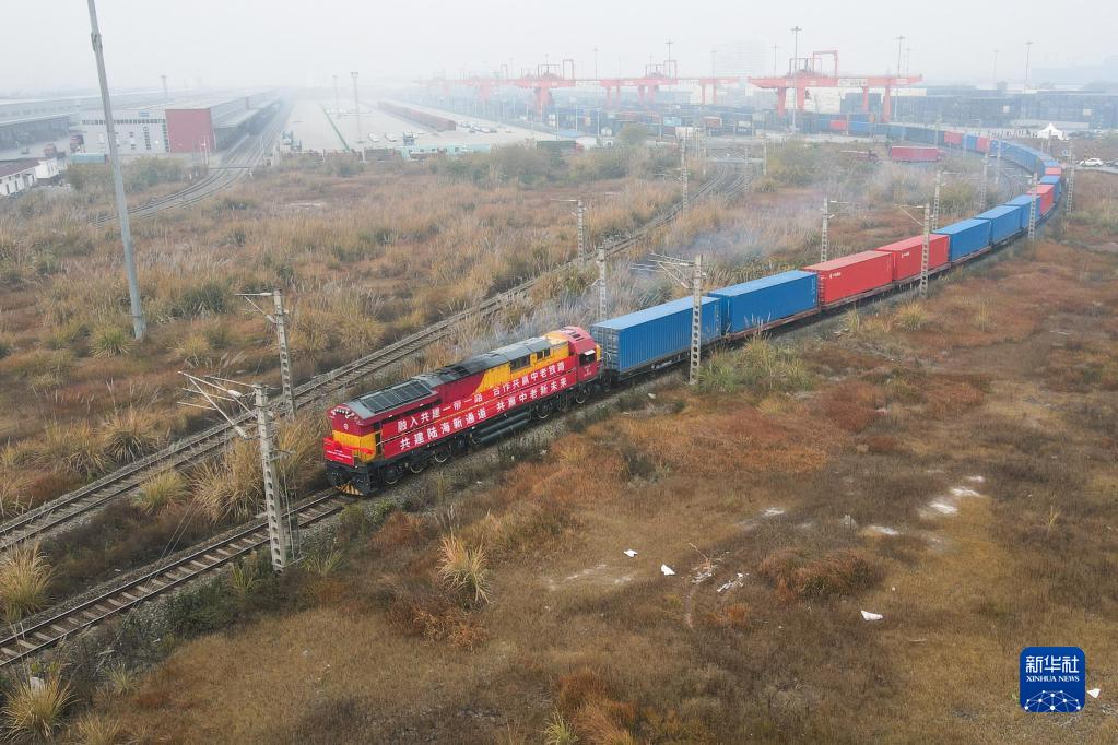 12月4日,从成都国际铁路港发出的中老铁路(成渝—万象)国际货运班列行驶在铁路上(无人机照片)。