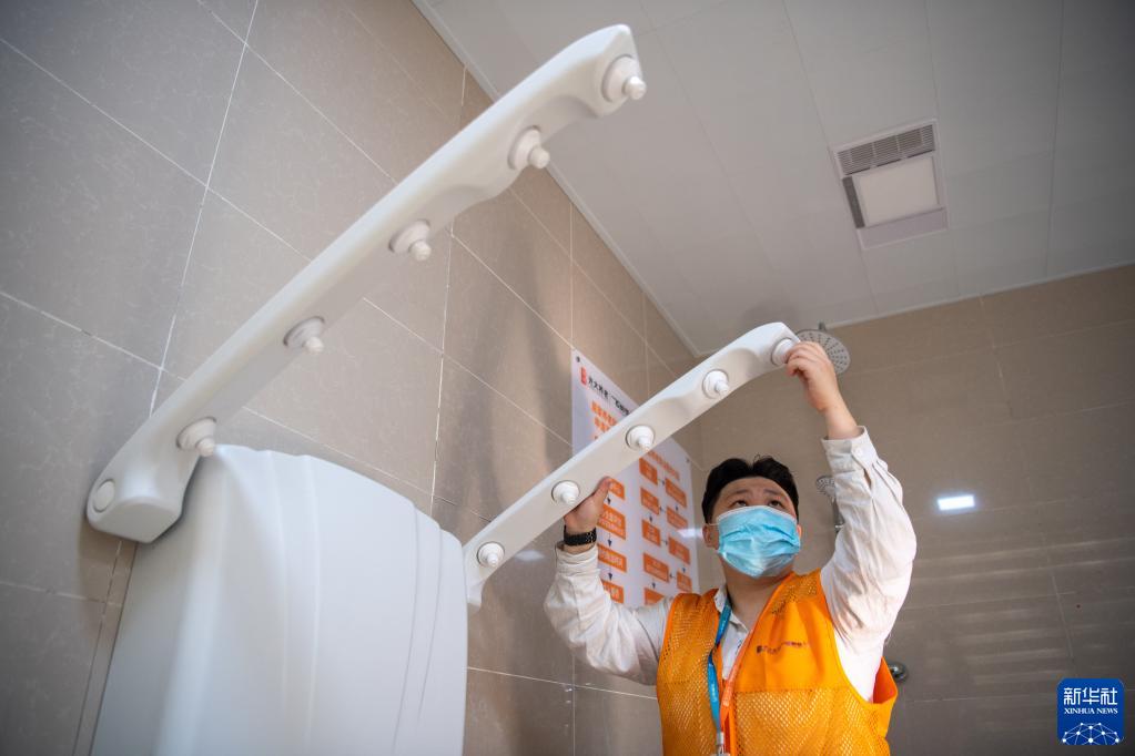 12月2日,在重庆市渝北区仙桃街道养老服务中心,护理员陈傲在助浴间调试助浴设备。