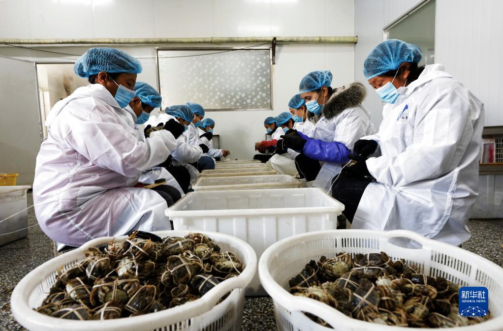 12月4日,在泗洪县一水产品出口加工基地,工人在生产车间捆扎清洗后的螃蟹。
