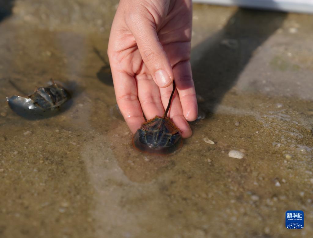 当日,在广西北海金海湾红树林生态旅游区,2500余尾中国鲎幼鲎被成功放流。新华社记者 杨驰 摄