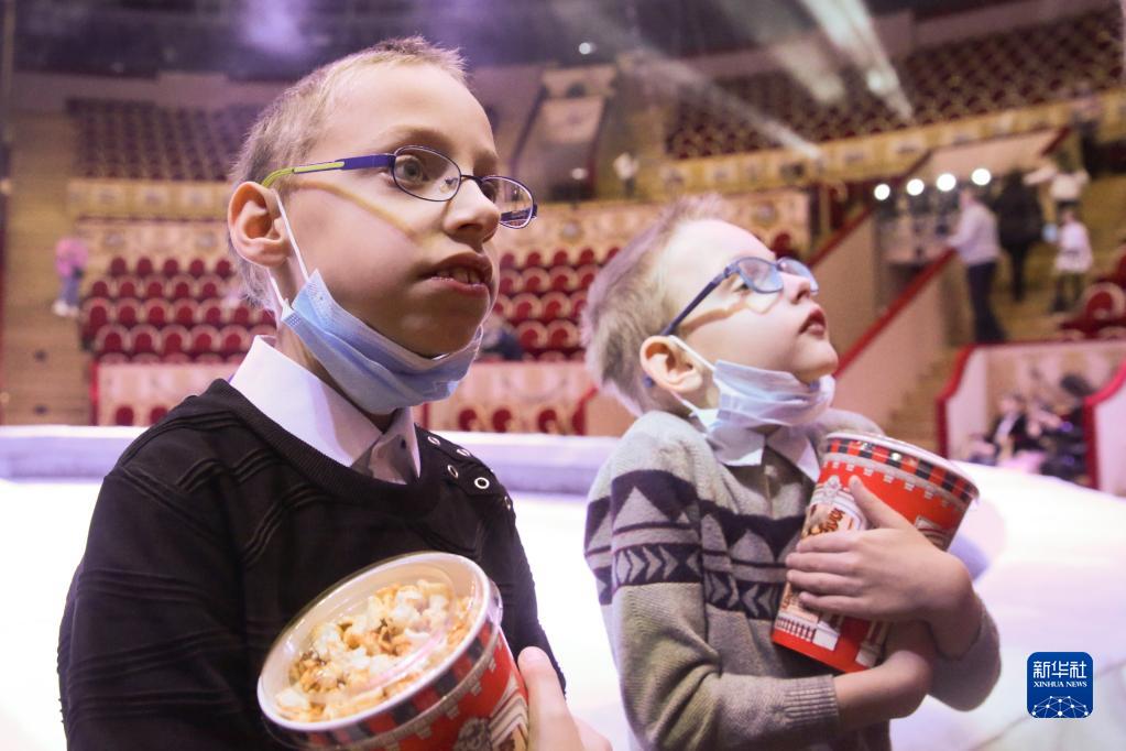 12月3日,小朋友在俄罗斯圣彼得堡国立大马戏院手捧爆米花等待观看马戏表演。