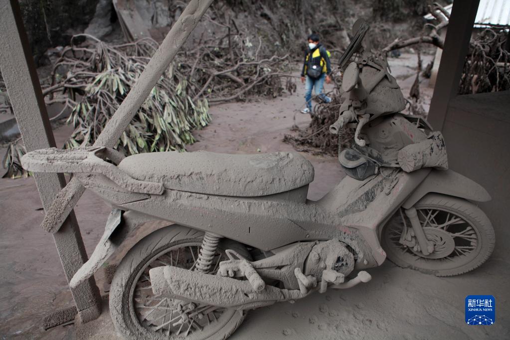 这是12月5日在印度尼西亚爪哇岛东部卢马姜拍摄的被火山喷发物覆盖的摩托车。