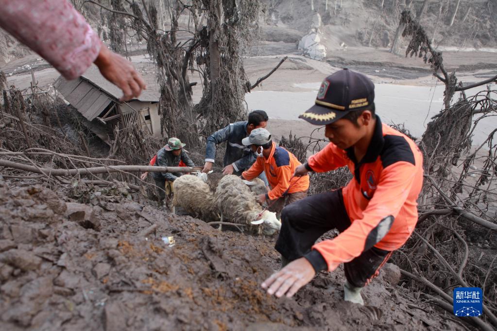 12月5日,在印度尼西亚爪哇岛东部卢马姜,人们在火山喷发后营救绵羊。