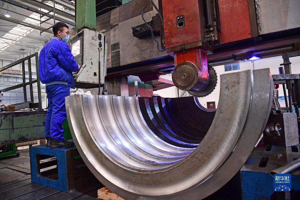在沈阳鼓风机集团车间,工人通过屏幕操作机器加工产品内机壳(2020年3月16日摄)。