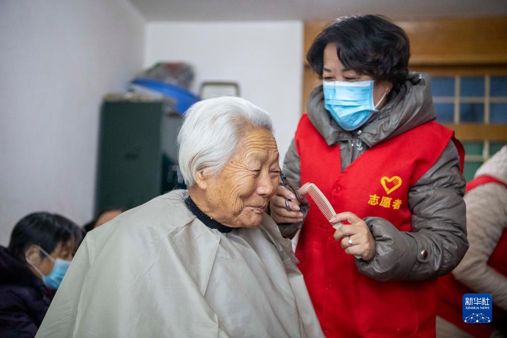 在山西省太原市杏花岭区铁路迎春小区,山西省红十字情缘志愿服务队志愿者赵杰(右)为独居老人谢淑英理发(12月1日摄)。