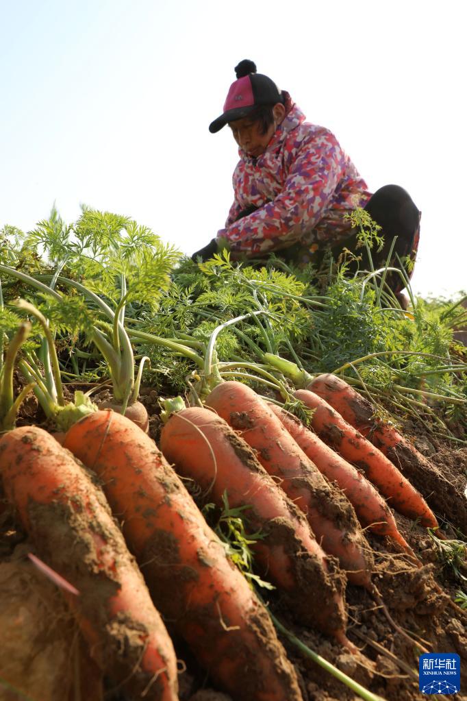 初冬时节,河南省焦作市温县黄河滩区近万亩胡萝卜喜获丰收,当地农民抓紧晴好天气采收、清洗和销售。