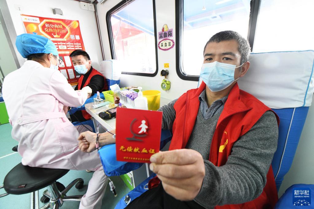 12月5日,在河北石家庄新乐市新开路献血屋内,志愿者在无偿献血。