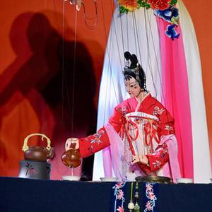 12月5日,演员在福建省街头文化艺术展演活动上表演木偶茶艺。