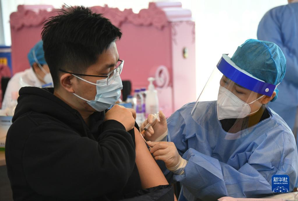 12月7日,在海国瑞业科技园的一家企业,医护人员为企业员工接种新冠疫苗加强针。
