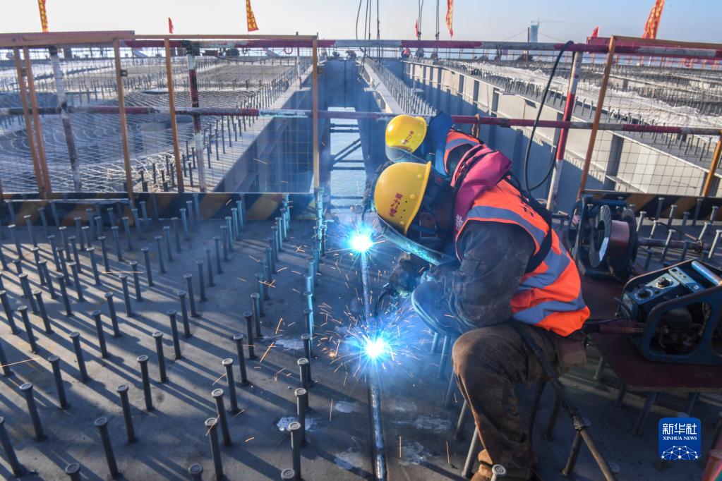 12月7日,在西村港跨海大桥建设现场,工人对合龙后的桥面接缝进行焊接。
