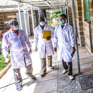 6月25日,在肯尼亚纳库鲁郡的埃格顿大学孔子学院,来自中国的农学教授刘高琼(左)与肯尼亚农业专家、中肯作物分子生物学联合实验室主任理查德·穆卢瓦(中)及肯方研究生在实验室内交流实验成果。