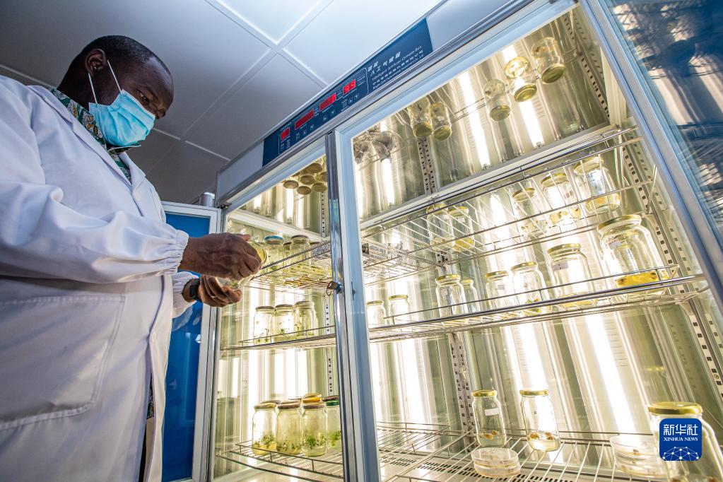 6月25日,在肯尼亚纳库鲁郡的埃格顿大学孔子学院,肯尼亚农业专家、中肯作物分子生物学联合实验室主任理查德·穆卢瓦在实验室内检查培养的样本。