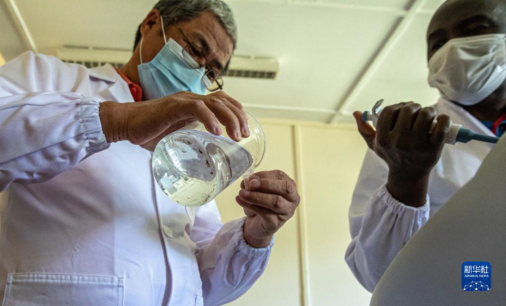 6月25日,在肯尼亚纳库鲁郡的埃格顿大学孔子学院,来自中国的农学教授刘高琼(左)和肯方工作人员一起做实验。