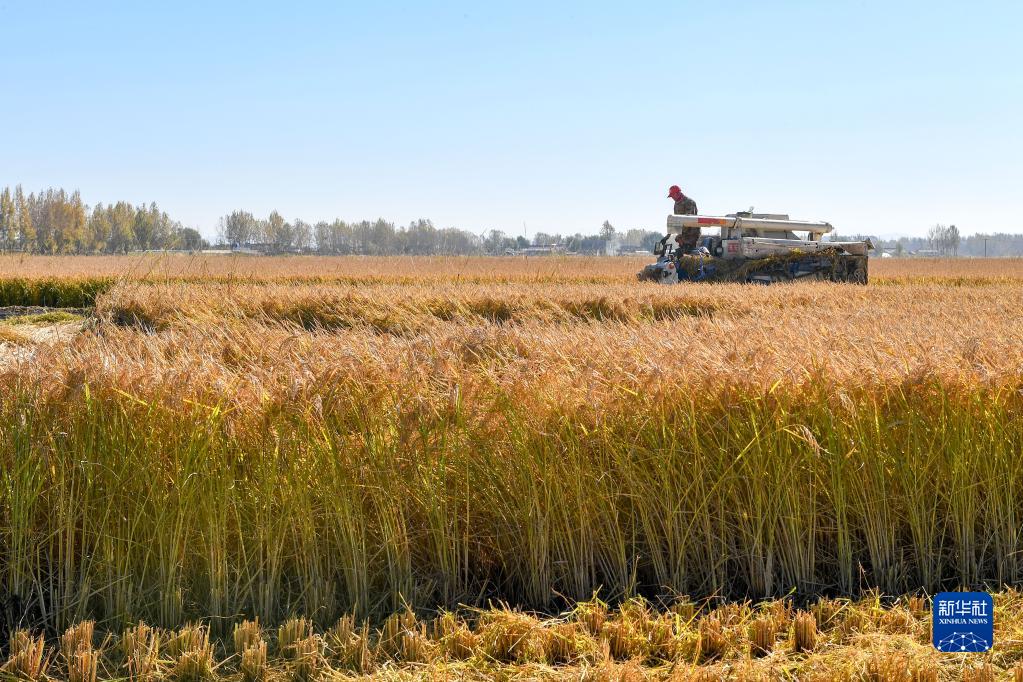 在吉林省吉林市永吉县万昌镇,农民驾驶农机收割水稻(10月12日摄)。