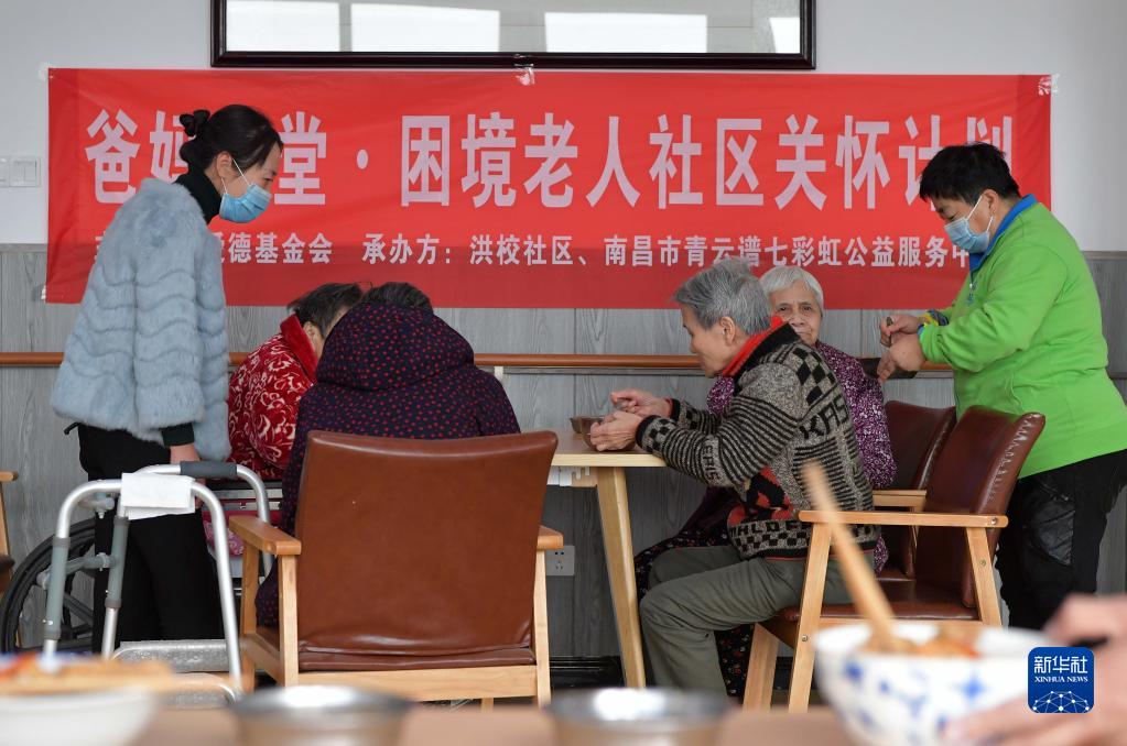 12月7日,老人们在江西省南昌市青云谱区洪都街道洪校社区“爸妈食堂”吃午饭。