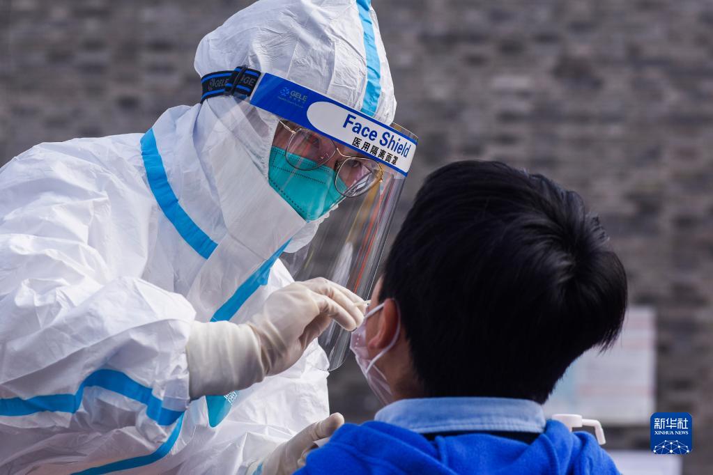12月7日,浙江省宁波市镇海区医护人员在陈倪路检测点给居民做核酸检测。