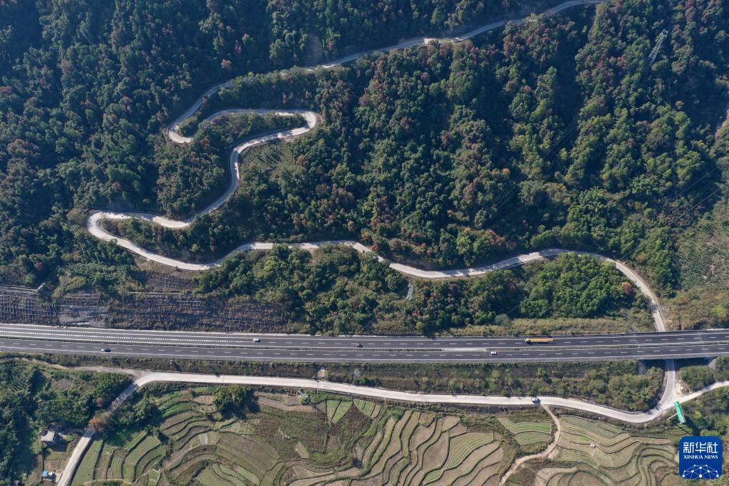 这是广西融安县潭头乡岭背村的村屯公路和穿村而过的三北高速公路(无人机照片,12月2日摄)。