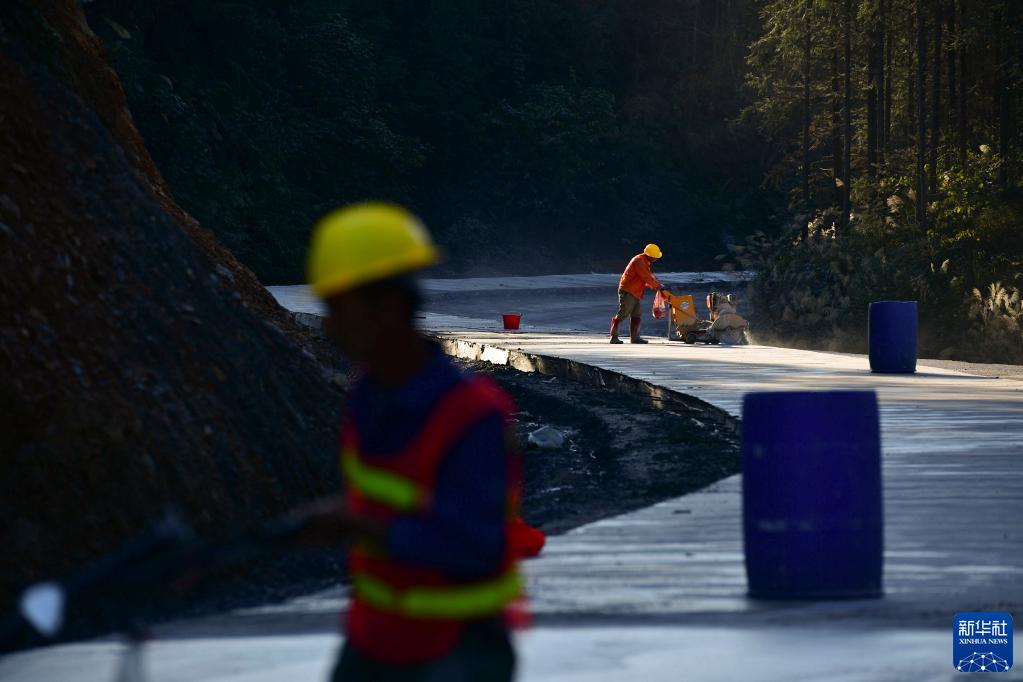 在广西融安县大坡乡,工人在公路建设工地施工(12月1日摄)。