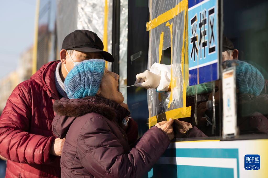 12月8日,在哈尔滨市南岗区一处核酸采样点,市民在接受核酸采样。