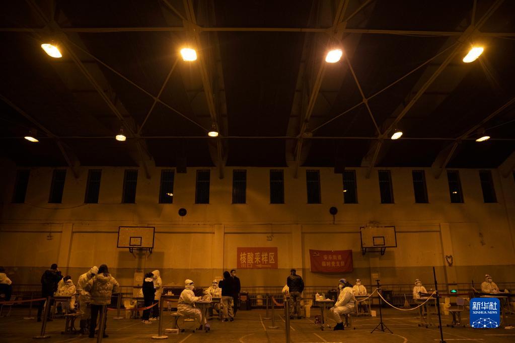 12月8日,在哈尔滨市香坊区安乐街道哈尔滨理工大学核酸检测点,医务人员进行核酸采样。