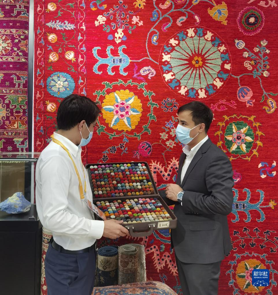 11月5日,阿富汗参展商阿里·法伊兹(右)在第四届进博会阿富汗手工羊毛地毯展台忙碌。