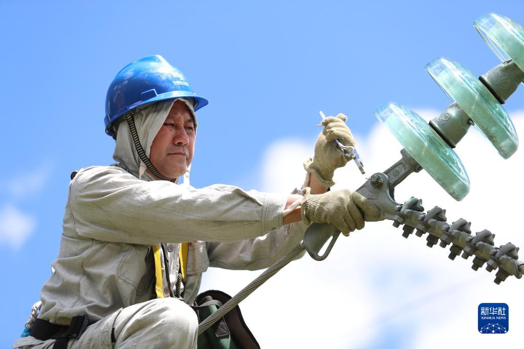 南方电网贵州兴义供电局输电所五班班长龙福刚用自己发明的安全工具在高空进行输电线路不停电(带电)检修工作(2018年9月4日摄)。新华社发