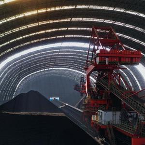 12月7日,唐山港曹妃甸港区煤炭码头的一台堆料机在煤仓内工作(无人机照片)。