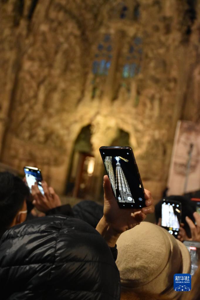 12月8日,人们在西班牙巴塞罗那拍摄圣家堂塔顶之星。