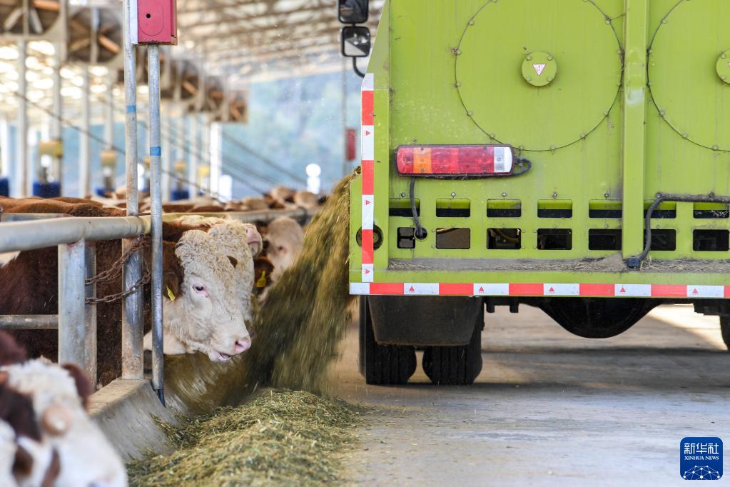 12月8日,在广西忻城县一家粤桂协作肉牛养殖基地,移动投料车在投喂饲料。