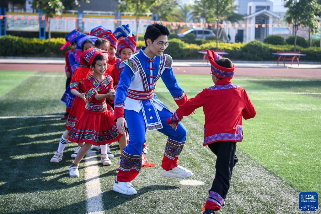 12月8日,在广西忻城县城关镇民族小学,来自广东信宜市的支教老师邓嘉添(右二)带领身穿民族服饰校服的学生做课间活动。