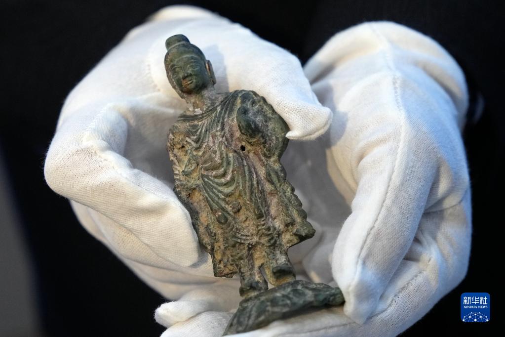 12月9日,考古工作者展示咸阳洪渎原墓葬考古发现的金铜释迦牟尼立像。新华社记者 李一博 摄