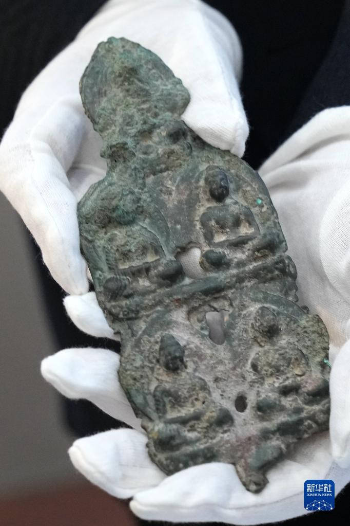 12月9日,考古工作者展示咸阳洪渎原墓葬考古发现的金铜五尊佛像。新华社记者 李一博 摄