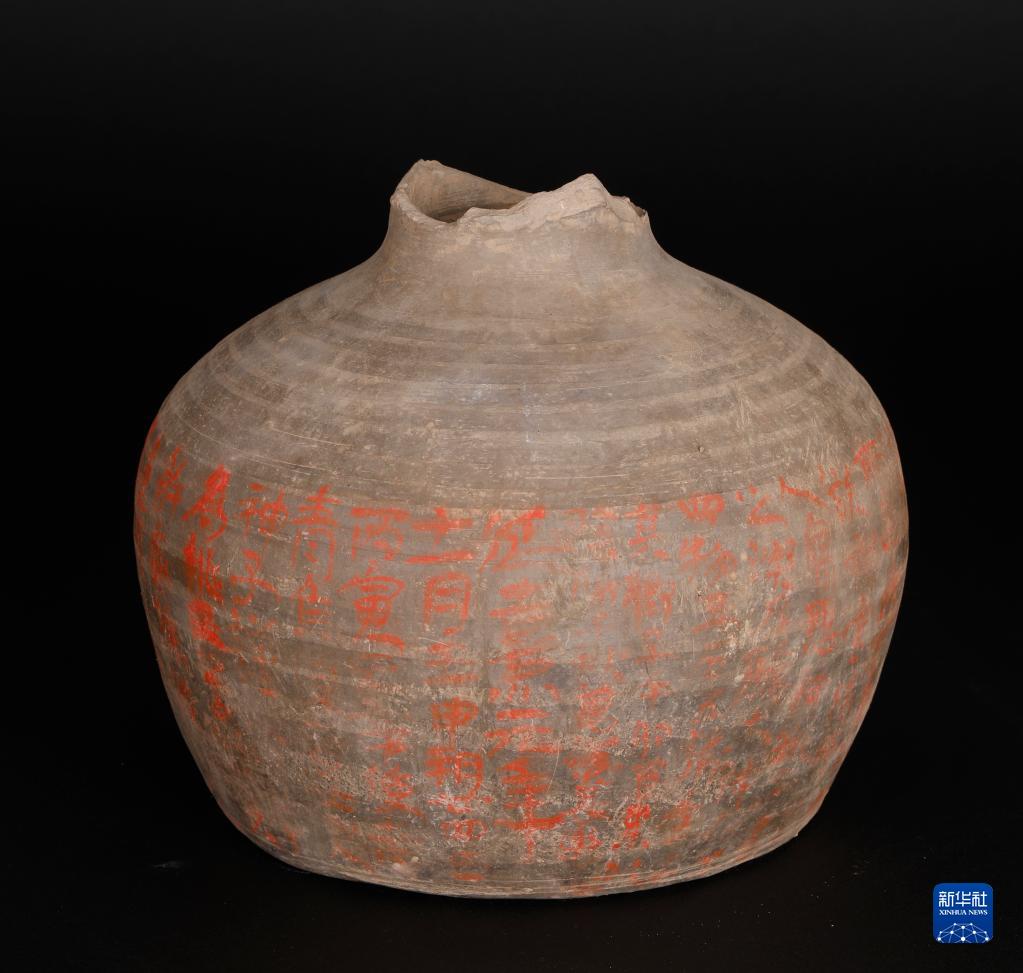这是在咸阳市渭城区成任墓地出土的延熹元年朱书陶罐(5月20日摄)。新华社发(陕西省考古研究院供图)