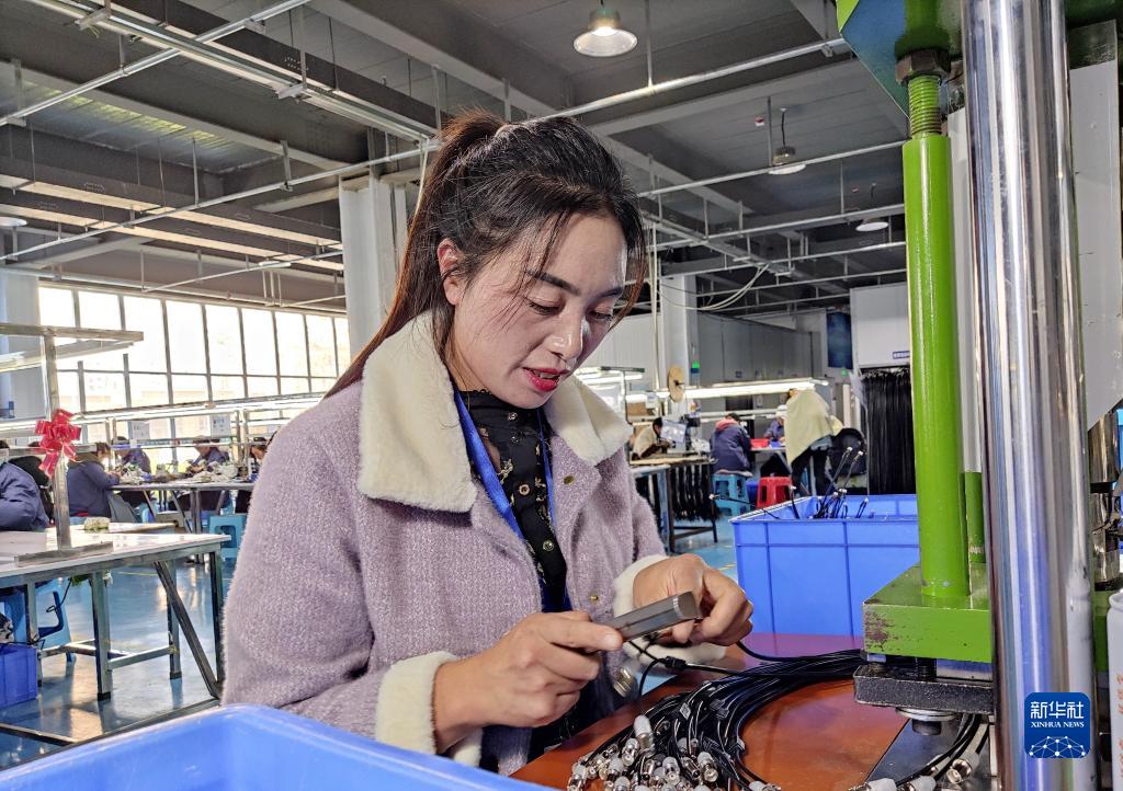 11月2日,一名搬迁群众在靖安新区一个电子设备扶贫车间工作。新华社记者 林碧锋 摄