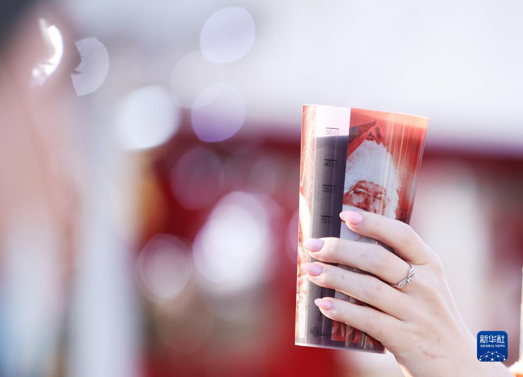 12月9日,在法国巴黎杜伊勒里花园的圣诞市场,一名女子举着圣诞市场的经典传统美食——热红酒。