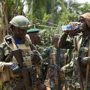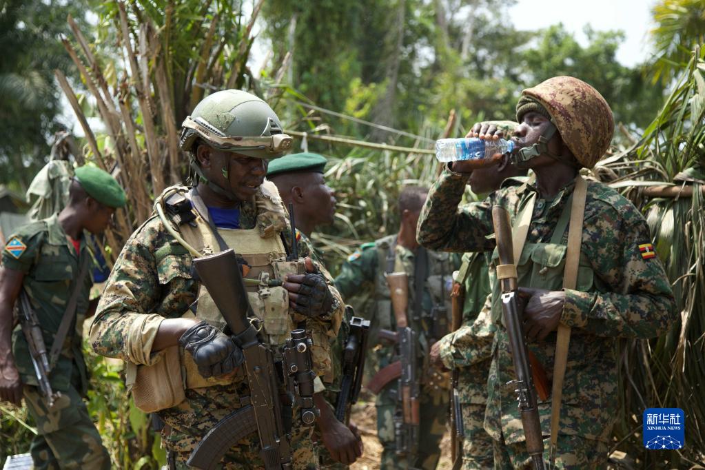 这是12月8日在刚果(金)东北部地区拍摄的参加联合军事行动的刚果(金)和乌干达士兵。