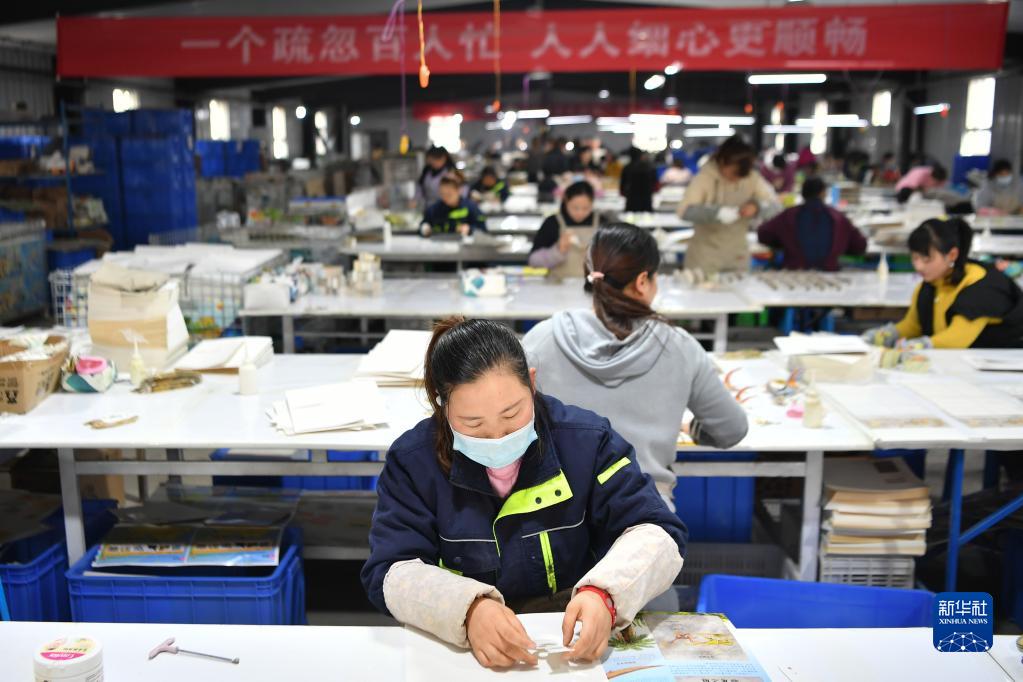 12月9日,西安市周至县骆峪镇黄家湾社区居民在社区工厂内制作图书。新华社记者 张博文 摄