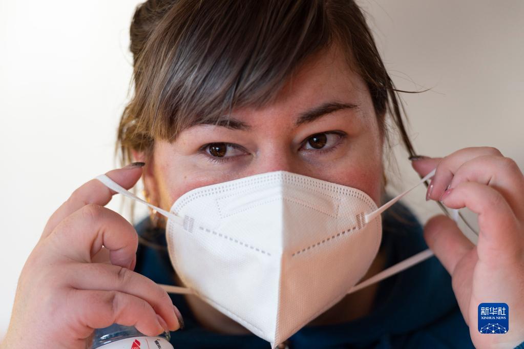 12月8日,在哈尔滨市松北区兴业社区,奥丽娅戴上口罩。