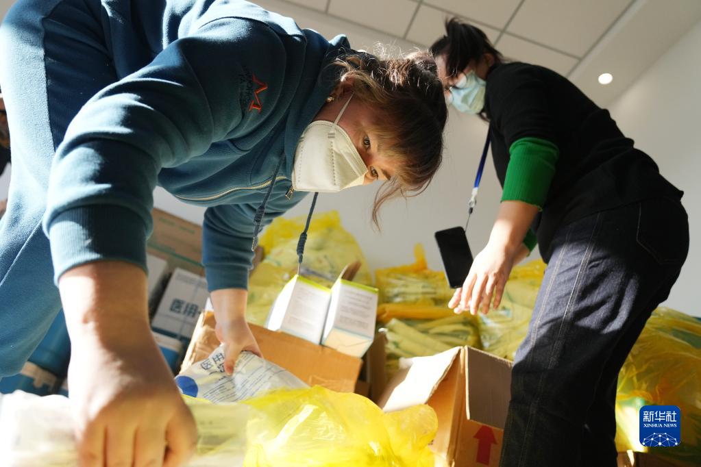 在哈尔滨市松北区兴业社区一房间内,奥丽娅(左)和社区工作人员一起整理防疫物资(12月8日摄)。