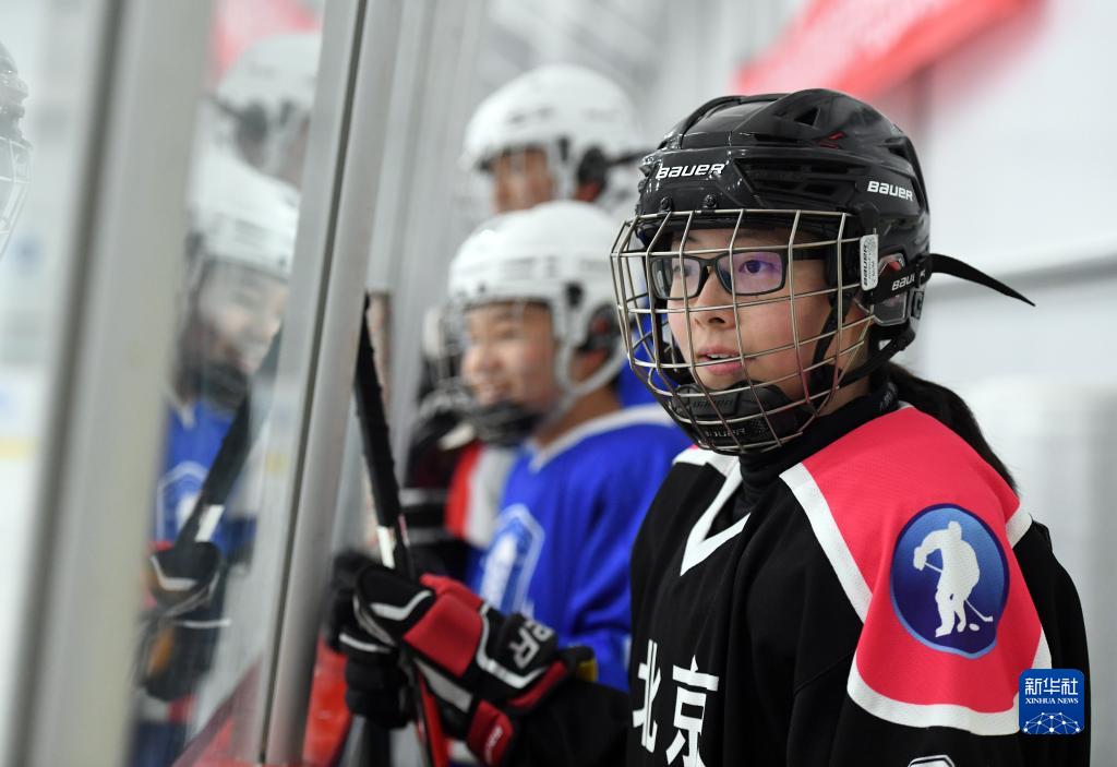 在北京科技大学附属中学冰上运动中心,张蓝心在队内比赛中观看队友的比赛情况(12月2日摄)。